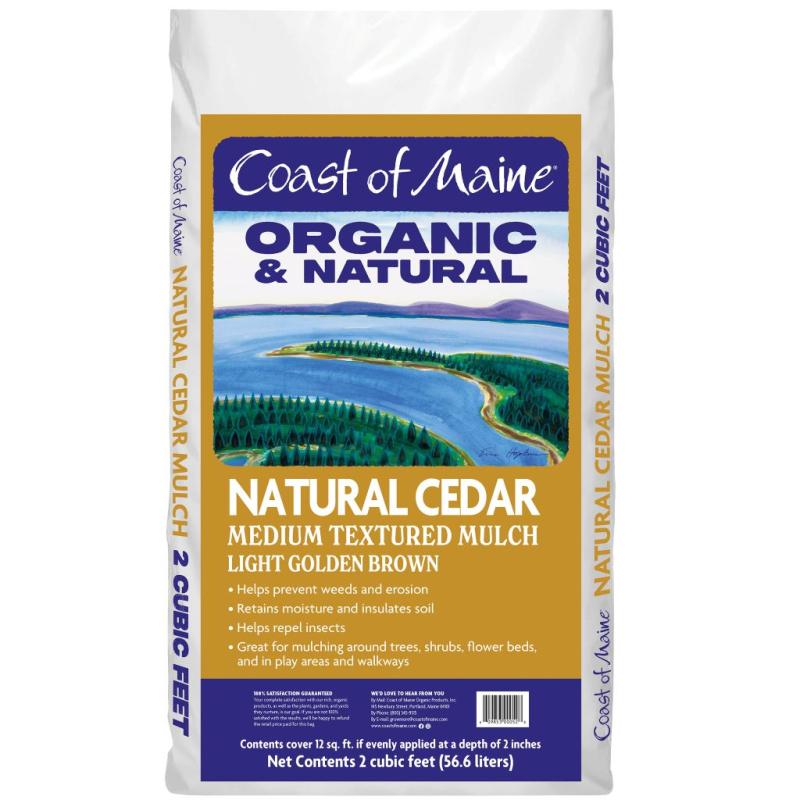 Description: Coast of Maine Natural Cedar Mulch is a premium, aromatic mulch made from double-ground cedar, offering a light, natural color and long-lasting performance. It helps retain soil moisture, suppresses weeds, and resists decay. Ideal for gardens, trees, and play areas, it enhances landscapes while providing durable, low-maintenance ground coverage.