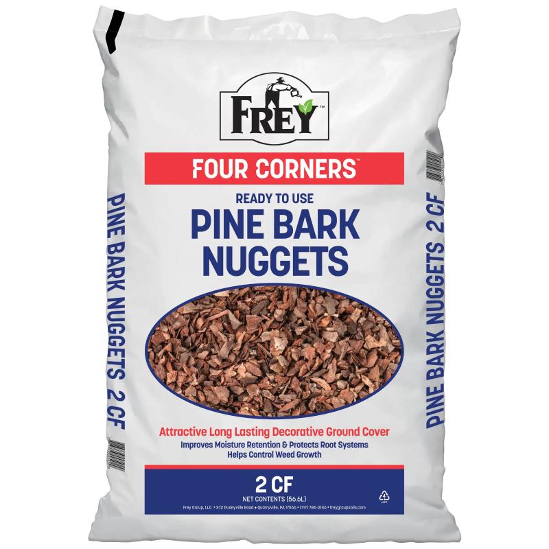 Description: Frey Brothers pine bark nuggets are a premium, natural mulch made from high-quality pine bark, offering a decorative and long-lasting ground cover. They help retain soil moisture, suppress weeds, and protect plant roots, while also enhancing the landscape's appearance. With consistent sizing and slow decomposition, they provide durable, low-maintenance performance for garden beds and landscaping projects.